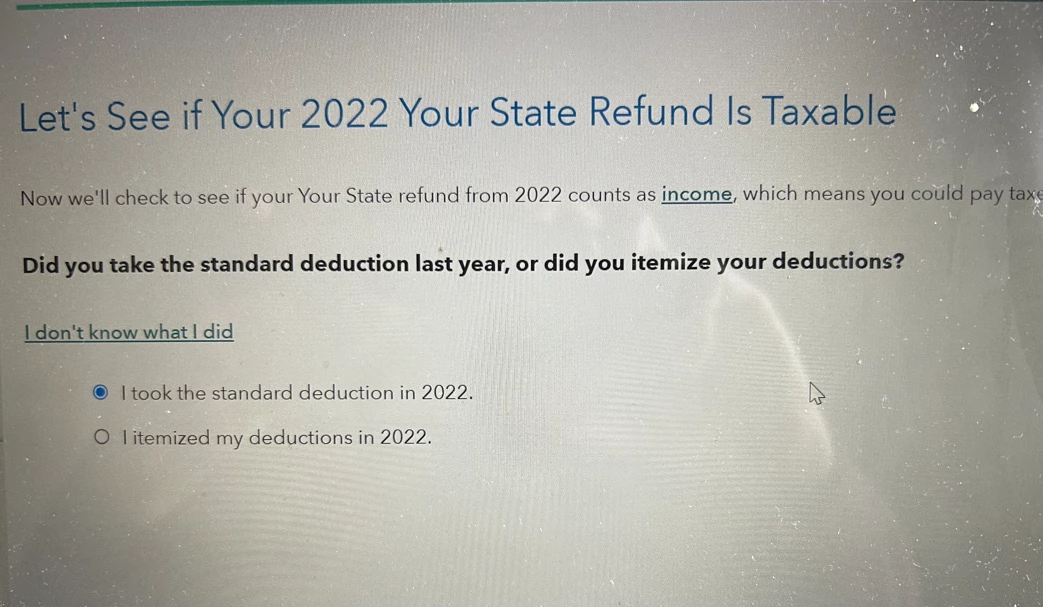 In the federal deduction section, there is : other common income-- state tax refund-see picture below, just imagine 2022 is 2023. I TOOK STANDARD DEDUCTION FOR FEDERAL IN 2023. So here is asking for federal or state deduction?