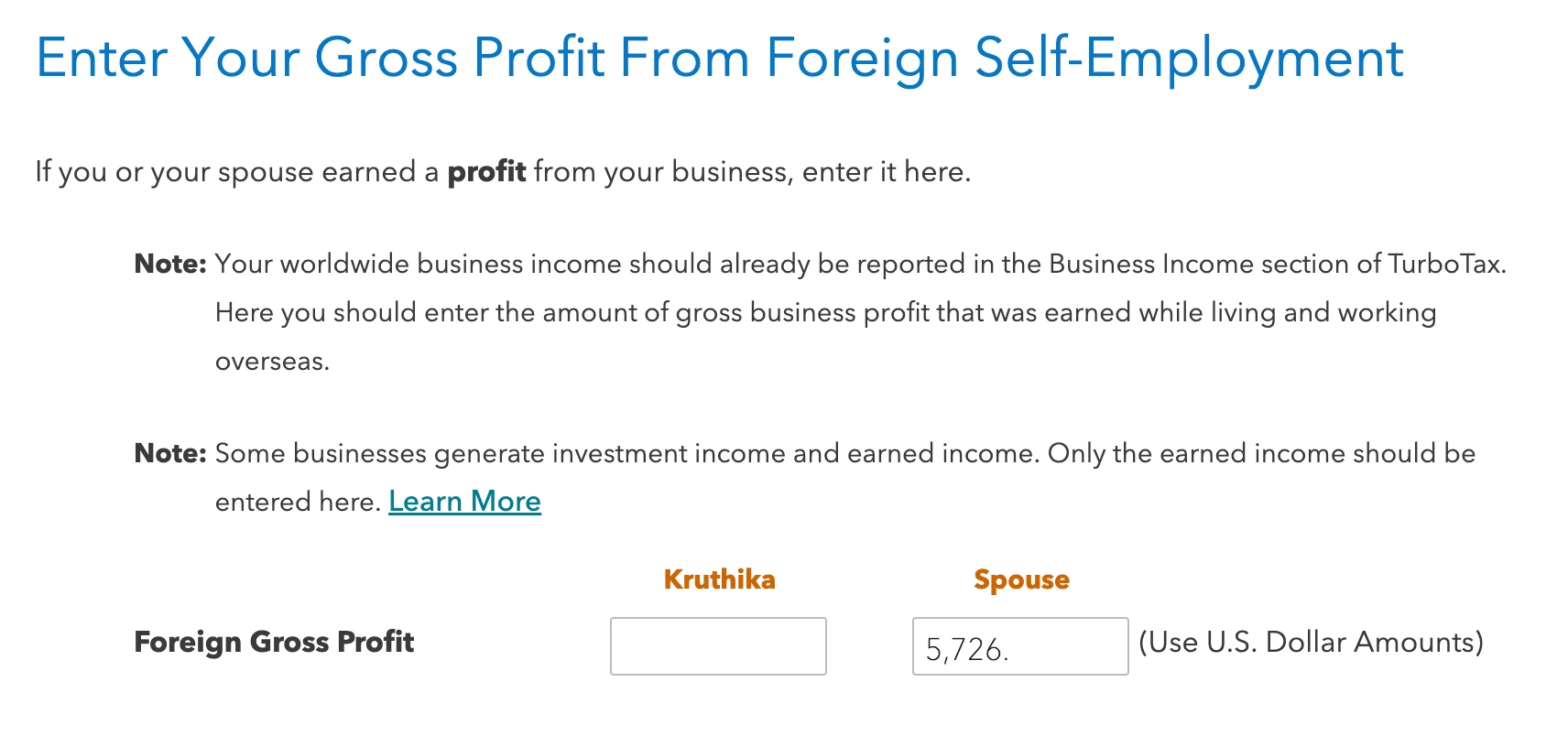 Next I went to the Foreign Earned Income and Exclusion section since he qualified for exclusion because of Bone fide presence test. My question is based on the above business income and expenses what should I enter in FEIE section as gross profit.