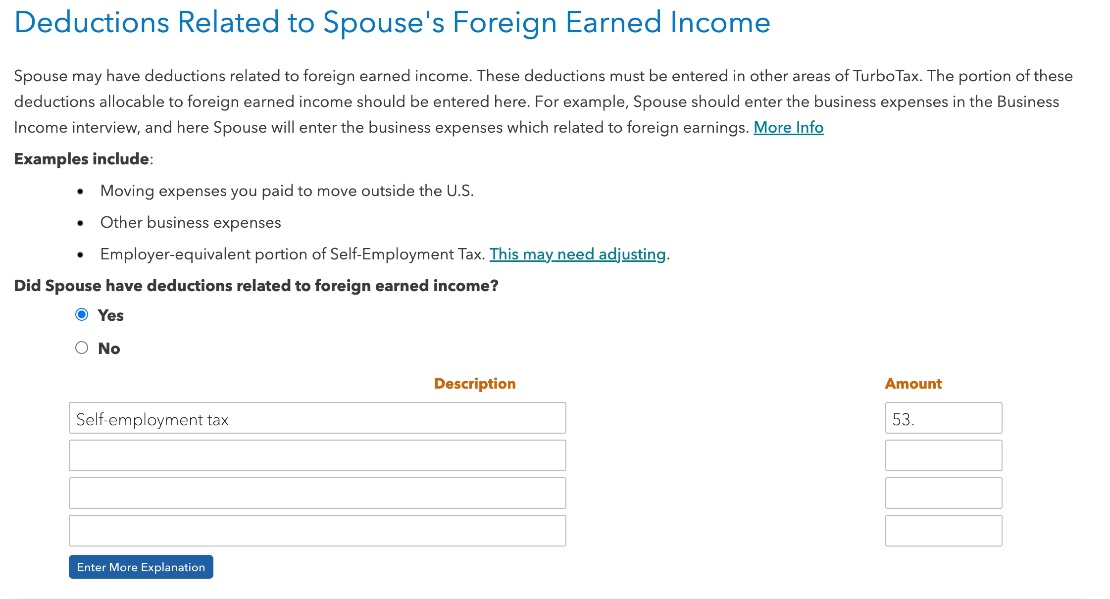 For the purposes of filing FEIE, all amounts are entered as gross income. You do not enter business expenses in this section. instead, these are entered in the Self-Employment and Farm income sections in your return. Instead it asks for deductions and exclusions related to foreign housing.