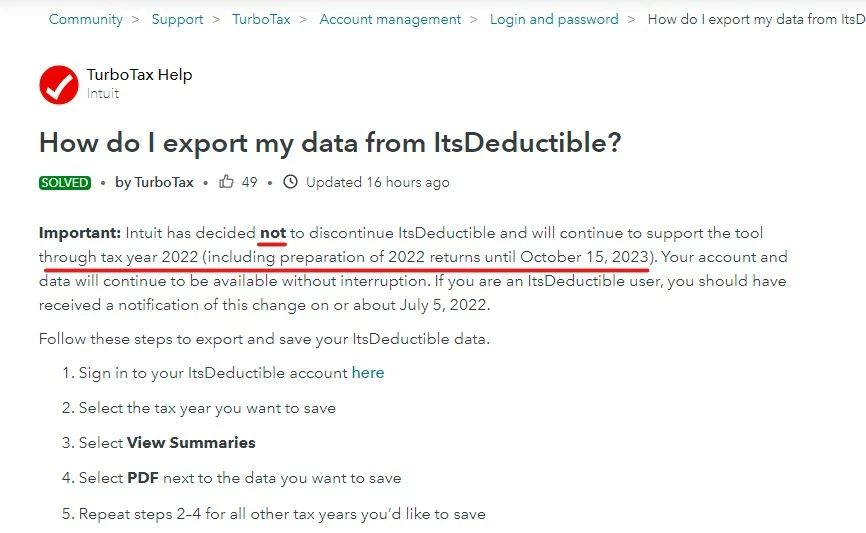 Unfortunately, TT only reinstated ItsDeductible for the 2022 Tax Year through October 15, 2023 (see below link from ItsDeductible) . After that, they will discontinue it again. If this many people rely on ItsDeductible and will switch tax programs, all the Income TT loses will be much higher than the cost of keeping ItsDeductible going!