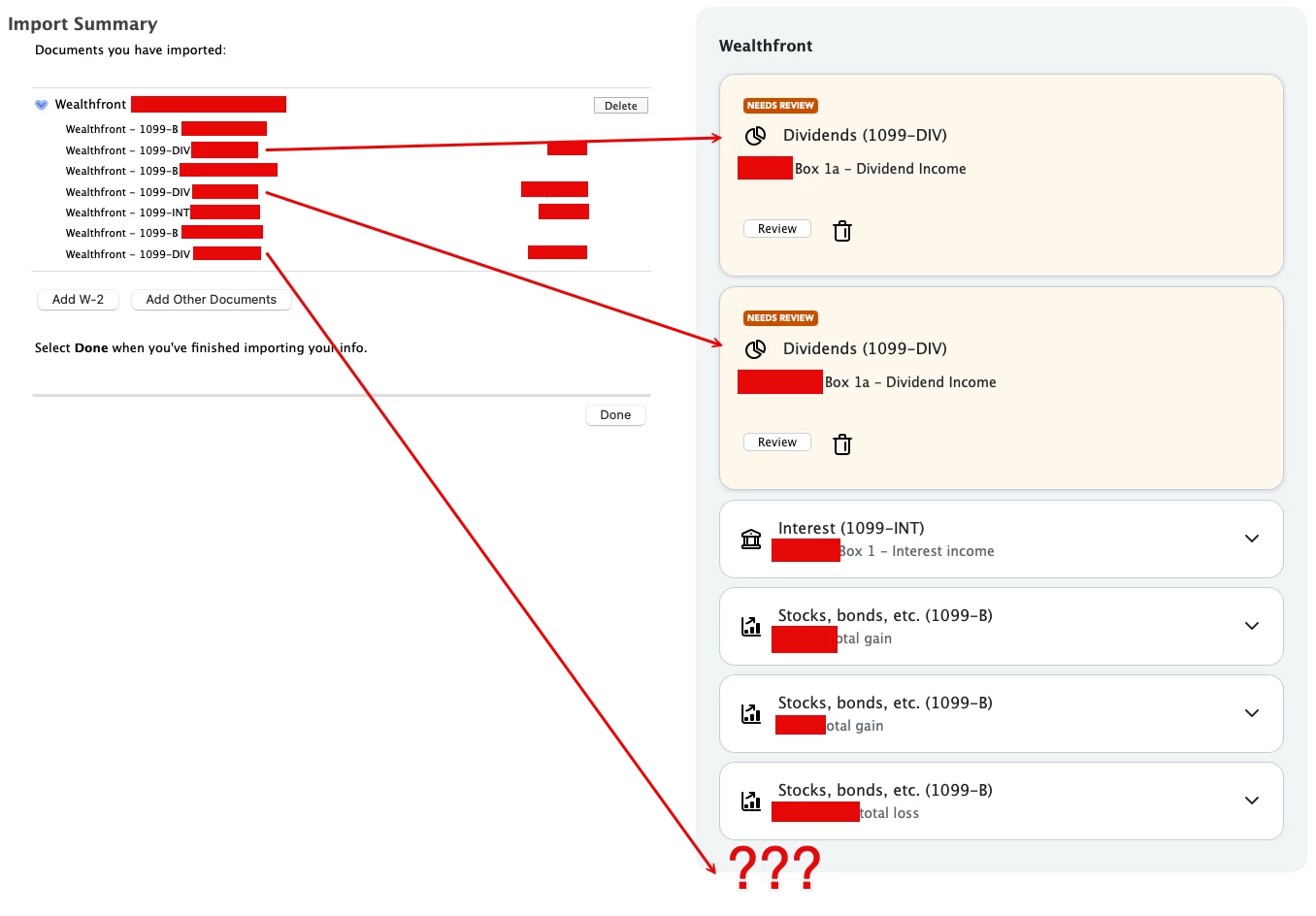 I have 3 brokerage accounts and 1 savings account in Wealthfront. When I import my Wealthfront accounts, I see that they're all listed in the Import Summary page. But when I go to "review" them, one of the 1099-DIV is not listed. When I go to Forms mode, that 1099-DIV doesn't exist. WHY???? Do I have to manually add the one that isn't there?