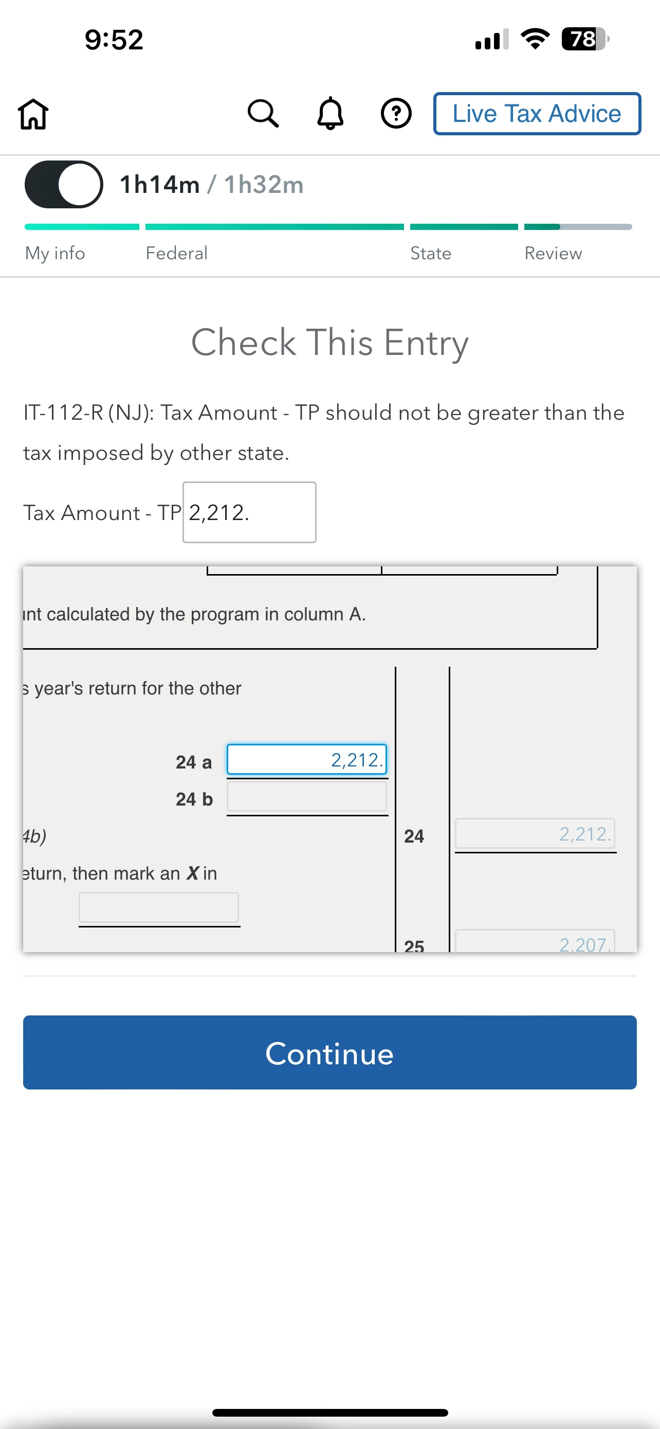 The amount you need to enter on line 24(a) of your IT-112-R is the total amount of tax liability calculated on your New Jersey tax return (located on line 49 on your Form NJ-1040NR.) Since you've already prepared your New Jersey non-resident return, review the entries on that return, including the summary at the end that shows what your total New Jersey tax liability was. For example, the end of the nonresident return will have a summary screen that shows something along the lines of New Jersey tax of $2202, with New Jersey withholding of $2212, and resulting in a refund of $9.
