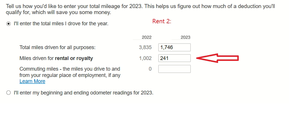 In the rental 2 interview, I entered 1,746 for 'Total miles driven for all purpose', and 241 for 'miles driven for rental and royalty'
