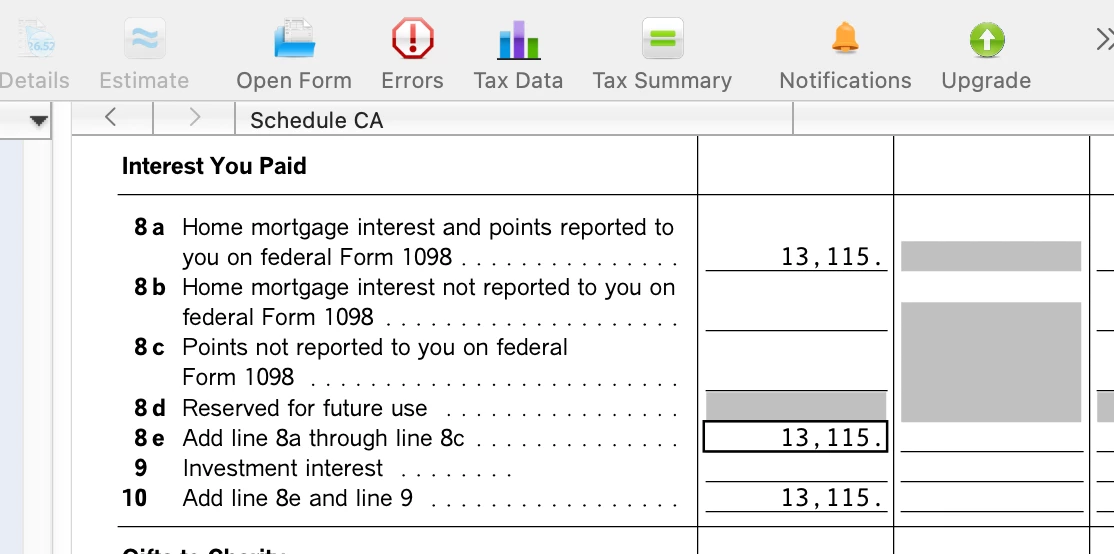 I have two mortgages entered in TT Premier for federal totaling $27,605. However, only one of those shows up in my CA adjustment sheet for $13,115. How do I fix this???