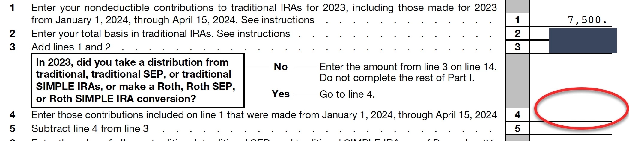 Yes, line 4 states "Enter those contributions included on line 1 that were made from January 1, 2024, through April 15, 2024" but this information is only needed if you made a distribution or conversion in 2023 to calculate the taxable part of the distribution or conversion. The amount on line 4 has to be excluded from line 3 for the calculation because it wasn't in the account in 2023 and therefore could not have been distributed or converted in 2023.