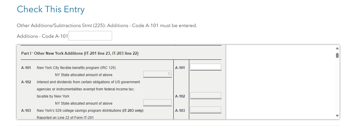 Code A-101 should not be entered directly on the other additions and subtractions statement for state electronic filing. You should enter the information on the Federal return, form W-2.