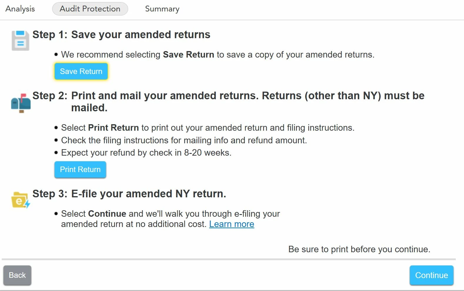 Hello. I used Turbox Desktop to file both federal and NY-amended returns of 2022. I have successfully filed the federal one by mailing the amended return. However, there was no response when I was trying to continue to e-file my NY amended return. Please see the picture below. After clicking "Continue" in the first interface, there was no response after clicking "Continue" in the second interface. I could not be directed to the NY e-file page. Does anyone know what to do?