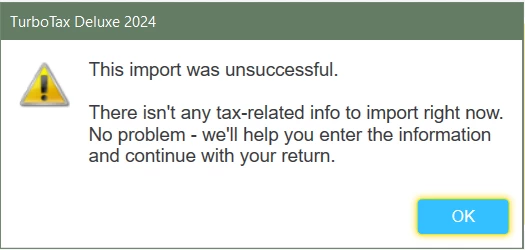 TurboTax thinks there isn't any tax-related info to import right now. Well TurboTax is off with the fairies because I am looking at my 1099 full of tax-related info!