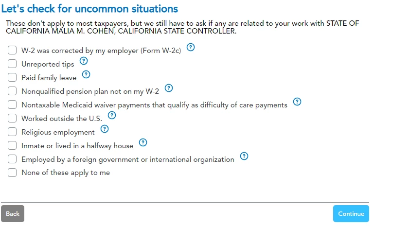 After I filled out my W2 form. I am getting to this page, and I don't understand if I should check "Paid Family Leave" or not. I also received PFL from EDD in 2023. However, I get a W2 from the California State Controller. Do I select Paid Family Leave because I received PFL from EDD, or do I check "None of these apply to me"?