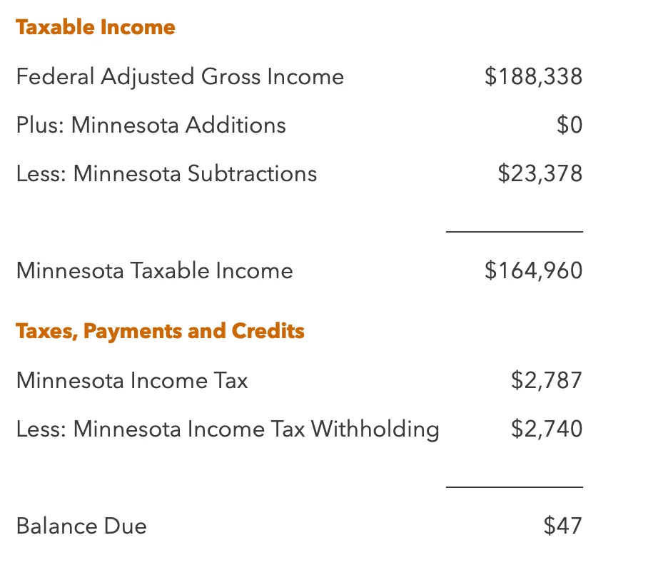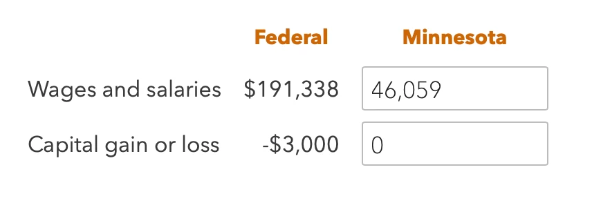 Then the next screen shows the MN tax summary which is completely wrong. It keeps saying my MN taxable income is 164960 despite only earning 46059 when I was in the state. See screenshot below.