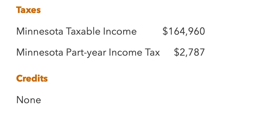Then the next screen goes to taxes and credit summary in which it keeps saying that my MN taxable income is 164960 and my part year income tax for MN is 2787. I don't know why turbotax keeps pulling my entire federal income minus deductions as my taxable income. Screenshot below.
