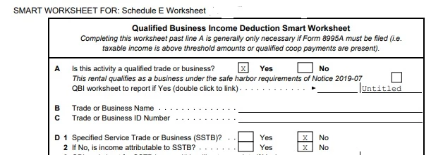 On my personal return, I have rental income on Sch E and it's not calculating the QBI deduction even after selecting "yes" to the question. Line 10 on my 1040 is blank. I looked at the Turbo Tax Smart Worksheet for Sch E (see attached pic) and the box where it would qualify for safe harbor is not checked. How do I check that box? I presume this is the reason it's not calculating the QBI deduction. I'm well under the income threshold for 2019.