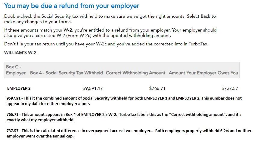 When this has happened in years past, TurboTax has handled it without any issue, but this year, it's giving me a "You may be due a refund from your employer" message -- and I think in this case there is a bug in TurboTax that is causing this.