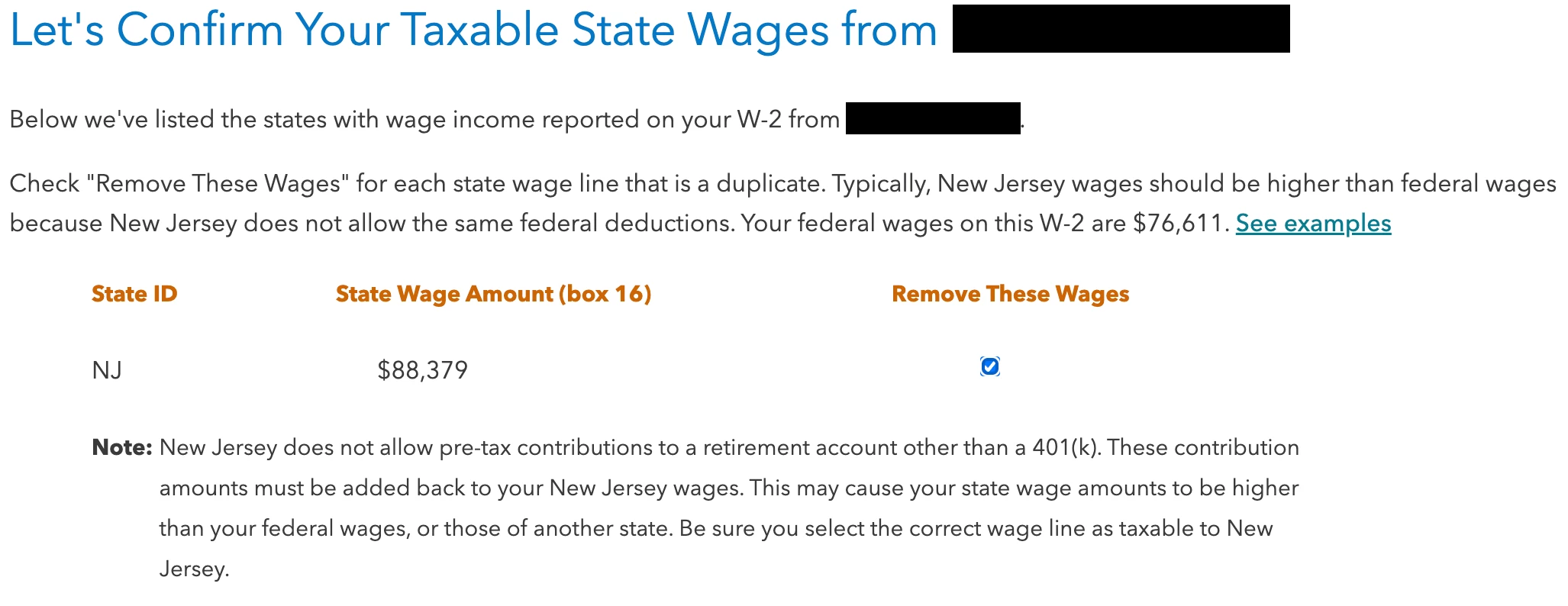 Therefore, you do not need to select "remove these wages" as they need to be reported on your New Jersey resident income tax return.