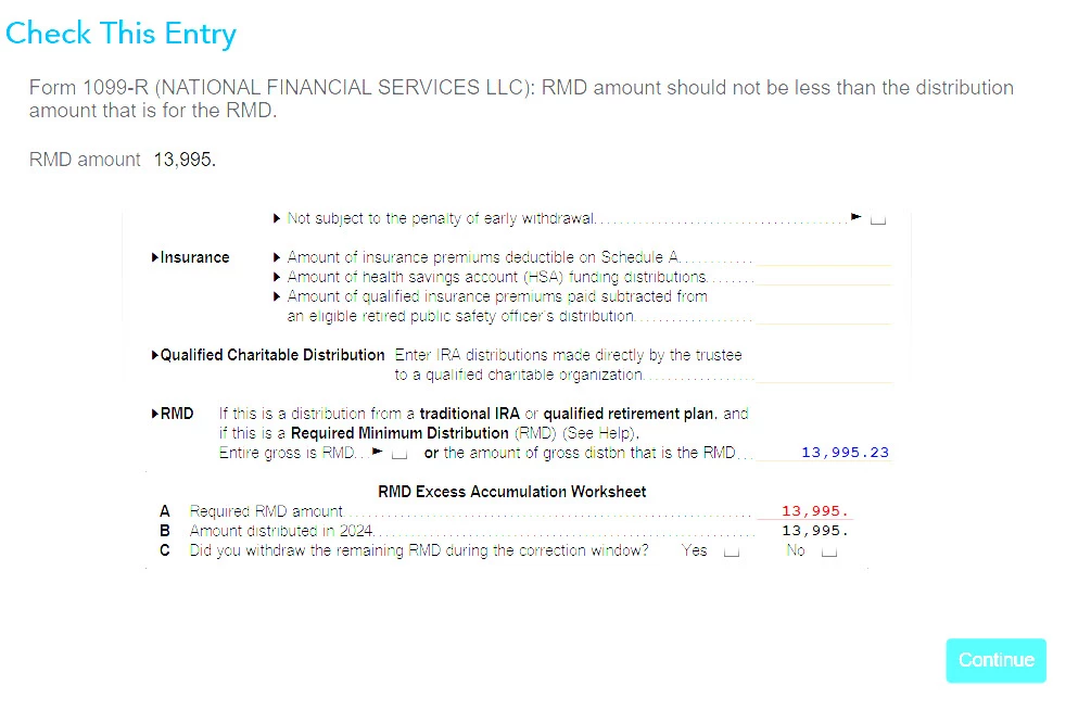 My total withdrawal from my IRA was $39817. My RMD was $13995. TurboTax is warning me that my distribution cannot be less than my RMD. Is this a bug?