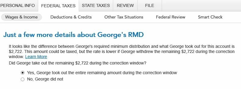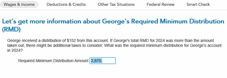 I have 2 IRA accounts. I took most of my required distribution from one account and increased the amount of taxes taken out to cover the withdraw from the other account. When I fill out my TT 1040, the question about the value of the RMD for this account (see the attached picture #1). Do I put the value of what the RMD would be for that account even though I took out the correct total for my RMD from both IRAs or the $152 that I took out from that account?