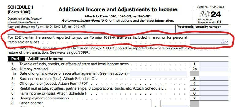 Schedule 1 - Entering adjustment to top line of form for personal items sold at a loss