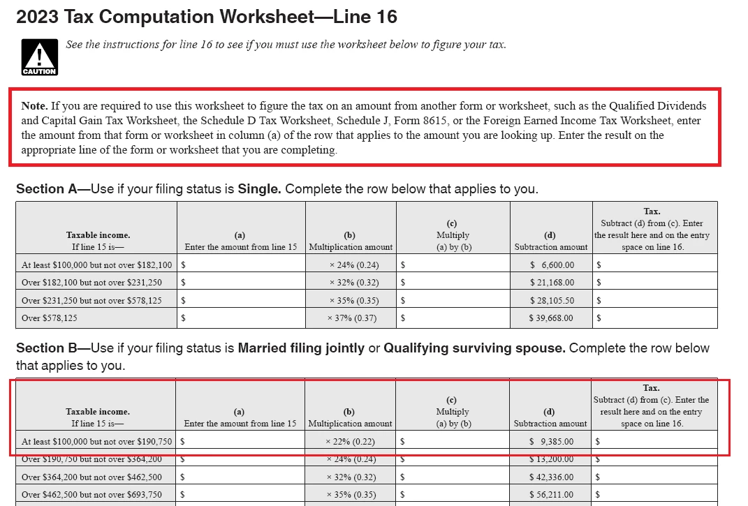 If your income is simple and straightforward without requiring additional special calculation worksheets, since your income was over $100,000, it likely used the "2023 Tax Computation Worksheet." If that's what is displayed as the method in the "Tax Smart Worksheet" mentioned above, below is an image from that worksheet.