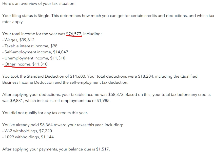 All is correct and matches what I've entered except for the "other income" category. It seems to just be duplicating the unemployment income but i can find where its getting that extra amount from. So in the breakdown its showing that my taxable income is $11,310 more than it should be, I've reviewed all the income I've entered and cant find where this extra bit is coming from.