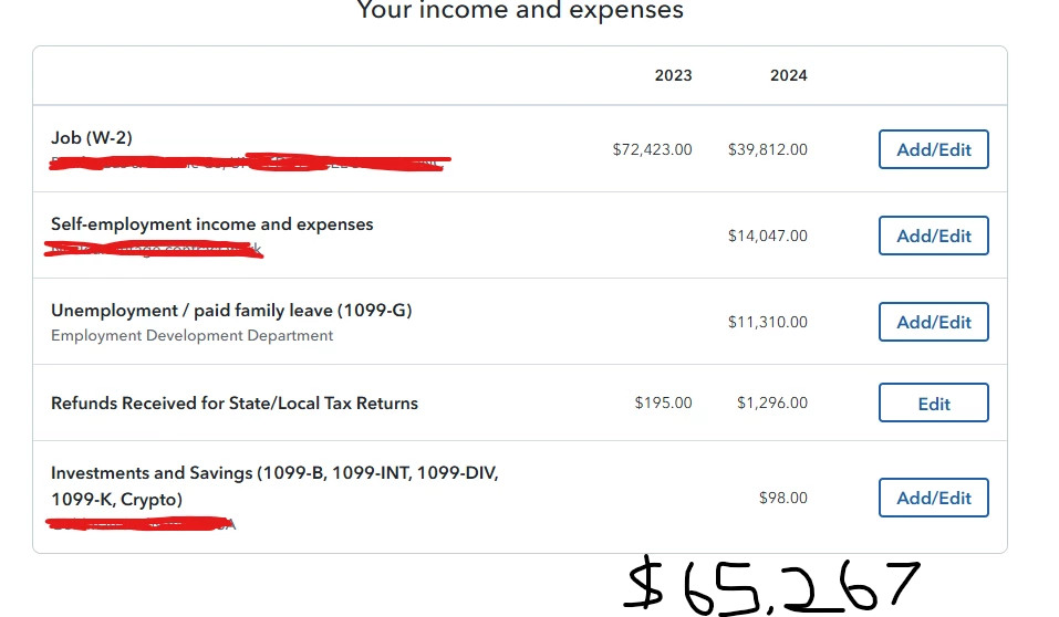 Total, $76,577 - Wages, $39,812 - Taxable interest income, $98 - Self-employment income, $14,047 - Unemployment income, $11,310 - Other income, $11,310.