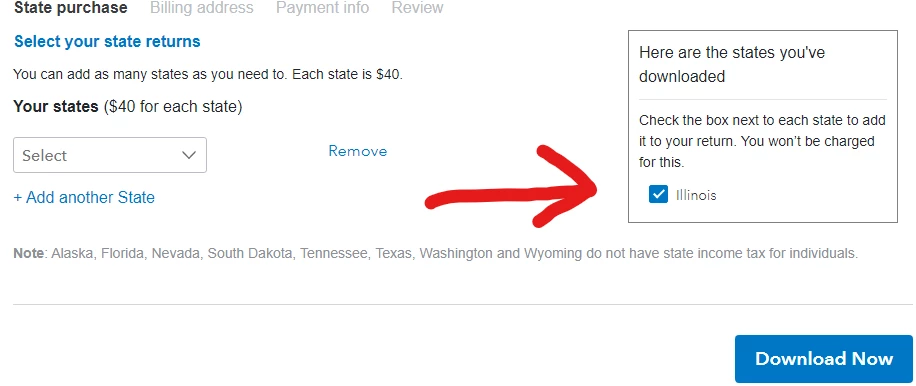 2 - Save the file and the State purchase screen appears. As you can see, I've already downloaded my free state - in this case, Illinois. Click "Download Now"