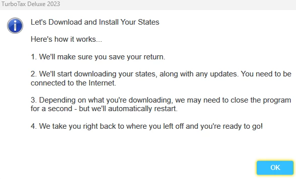 Since nothing else has worked, regardless of how many computers I try, I thought I'd give a detailed (pics) description of a looping error with the state download(s) from within TurboTax 2023. We'll start with the familiar setup that shows the following:
