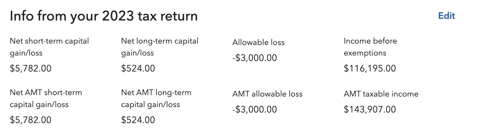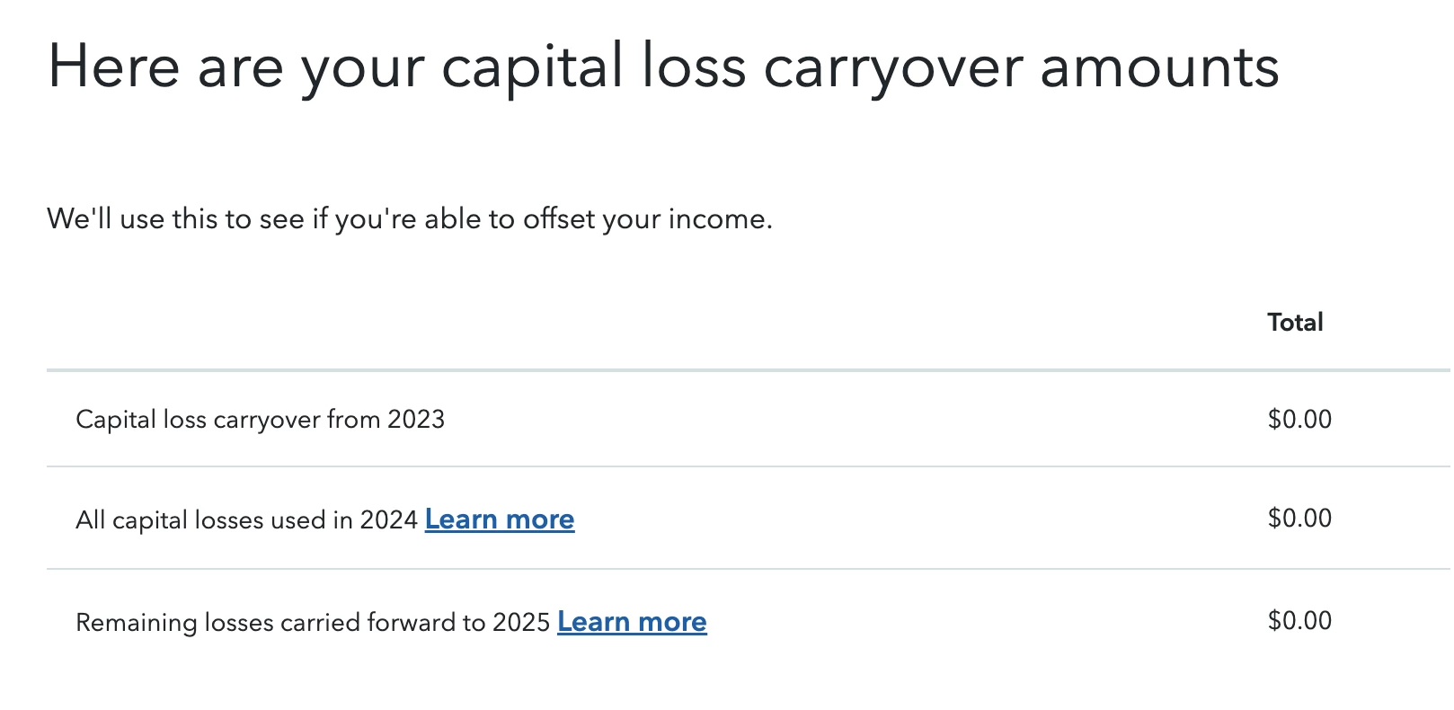 If you didn’t use Turbo Tax for 2023 you need to manually enter any carryover loss.   Is the top screen from your actual 2023 return?   That shows gains, not losses.  Do you need to enter the 5782 and 524 as Losses? They don’t have a minus sign - on them.