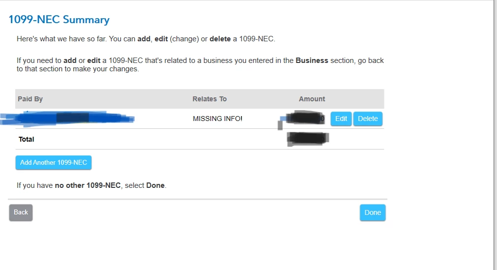 The missing information error is TurboTax wanting you to prepare Schedule C for the 1099-nec income. Entering as above reports it as Other Income.