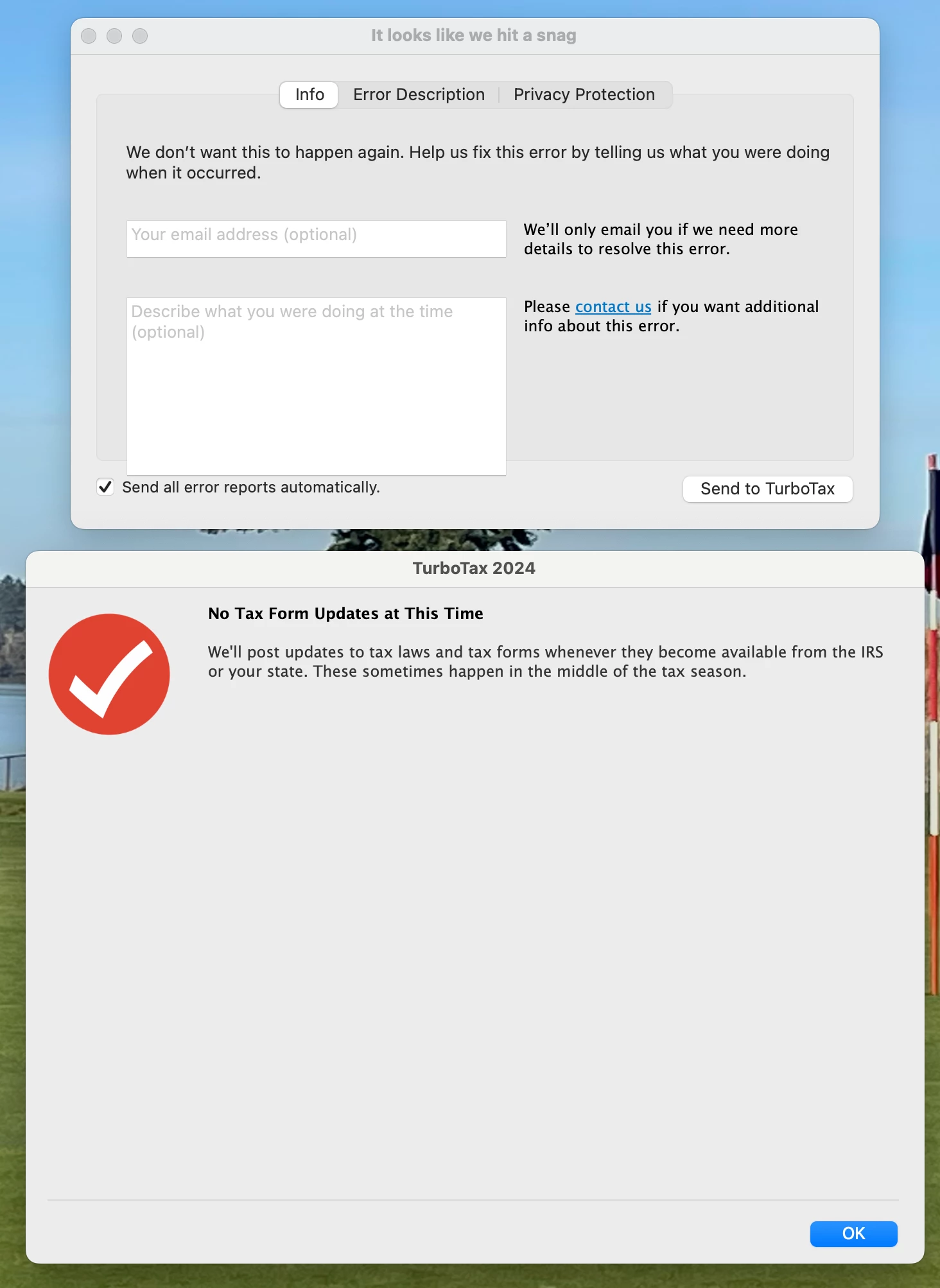 I got email saying schedule B was available so I fired up TurboTax desktop on my m1 mac mini. It downloaded and installed the required updates. Now every time it starts I get 'no tax form updates at this time' (it runs the updater every startup), and when I click OK then TurboTax simply exits after about 3 seconds. No way to actually USE it at all. It just seemingly aborts.