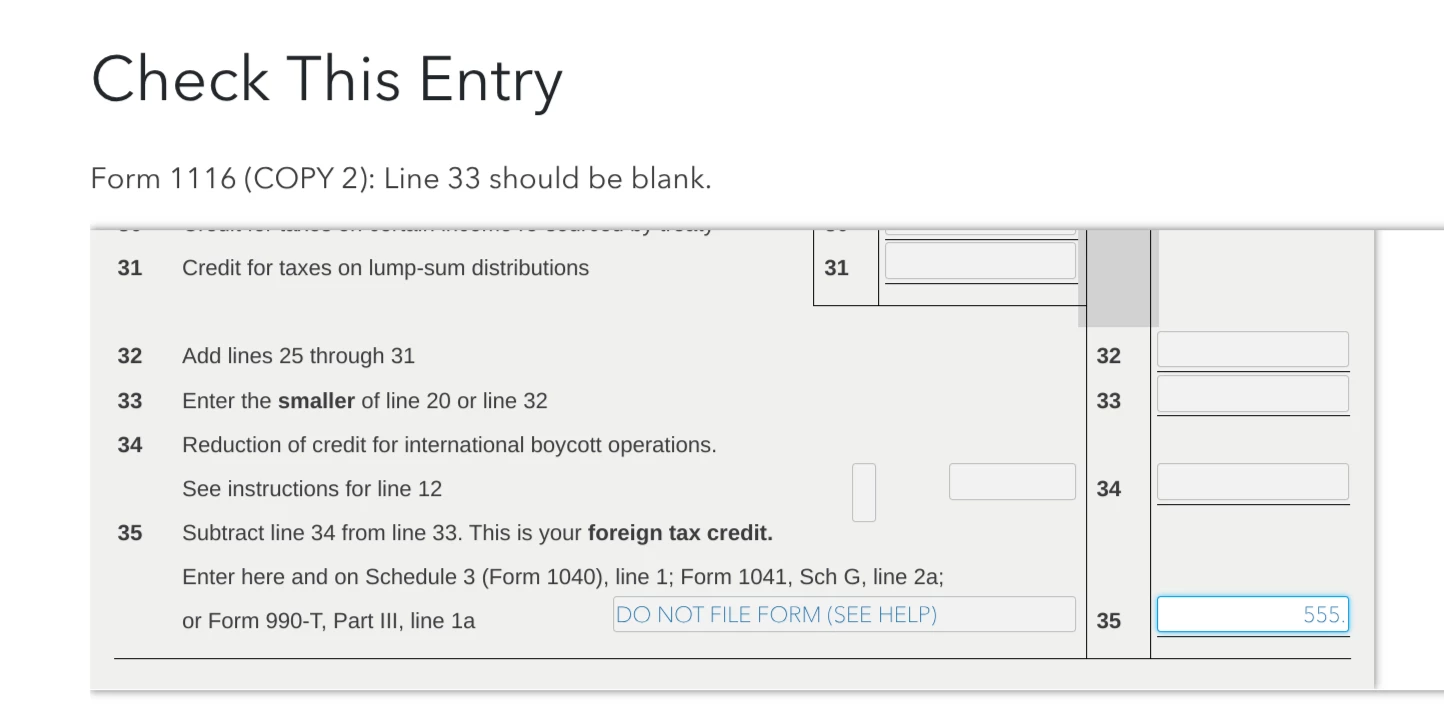 If you're using TurboTax Desktop, if there's no amount on Form 1116, Line 20, check Line 16 and 17 on your Form 1040 and enter that amount. Then Line 33 on Form 1116 will have that amount also.