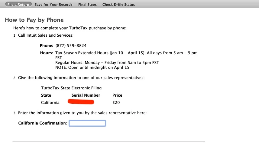 Spent 5+ hours on customer service over 6 different phone calls. Have been trying to pay this 20 dollar fee for 2 weeks. They cant figure out how/where to enter the serial number and cant give me a confirmation code. I was charged already and cant e-file.