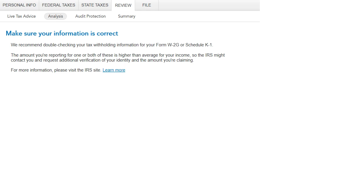turbotax asking to review withholding for form w2g and schedule k1 when I don't have any gambling winnings and have already answered no to receiving schedule k and didn’t add no W2G form. There’s no form w2g or schedule k1 to delete so don’t know why it pops this message.