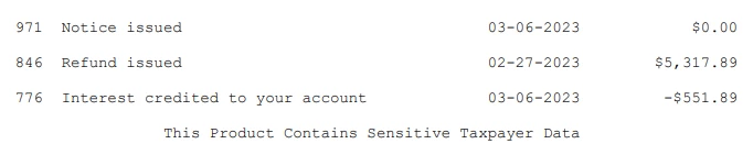An IRS Code 776 indicates you will see negative entries to signify the payment back to the IRS.