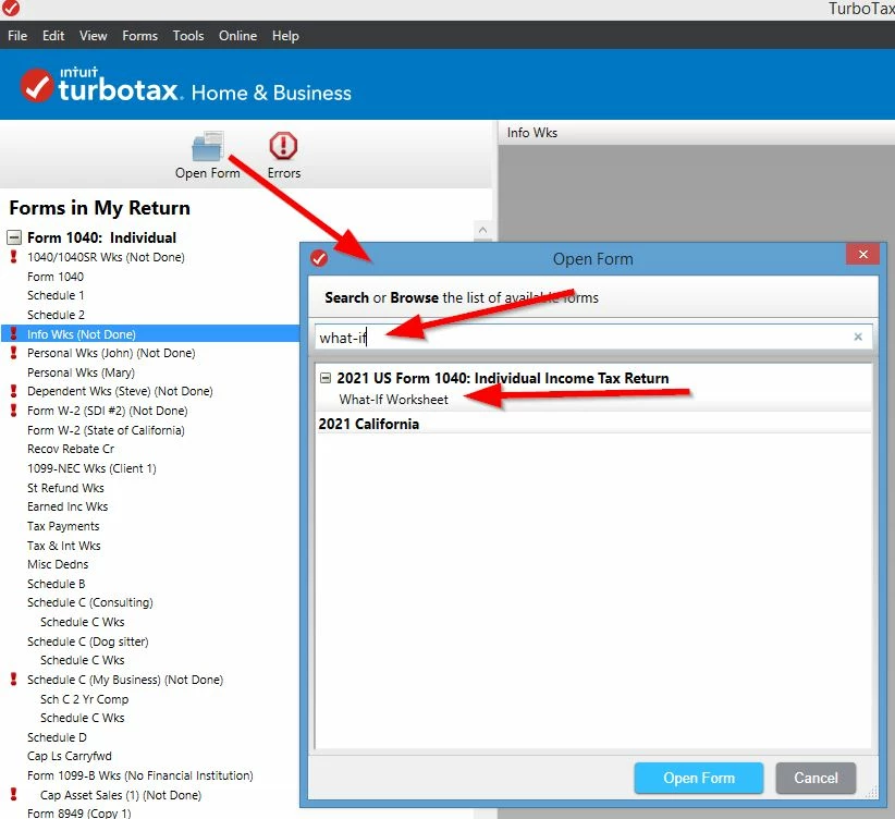 Go to Forms Mode, click Forms in the upper right or on the left for Mac. Then click Open Forms box in the top of the column on the left. Open the US listing of forms and towards the bottom find the What-if worksheet. It's right under Estimated Taxes.