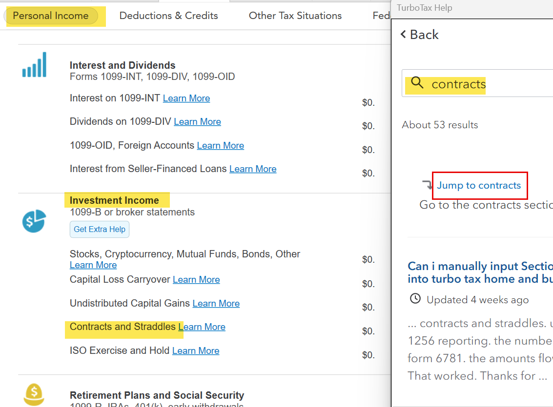 You can manually enter Contracts and Straddle information in the Investment Income section of TurboTax. Search for contracts and use the Jump to link. Or you can find it in the Income List also.