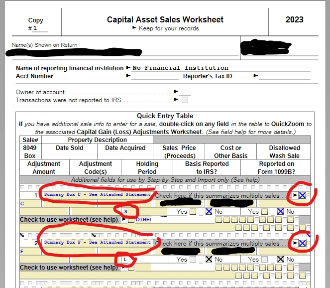 There is a bug in TurboTax's new 1099-B Step-by-step UI that will not ask if you want to enter summary information if you already have detail information elsewhere, even if it is for a different 8949 box (A through F). Under Forms view, I found the Capital Asset Sales Worksheet for my manually entered 1099-B and entered the following (circled). I also had to manually enter things that were automatic last year, such as including "see attached statement." Thankfully, Form 8453 generated correctly after making these changes.