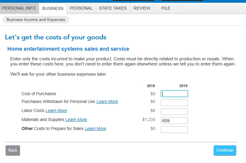 Enter on the next screen the costs that you had for the year in purchasing or making your inventory.