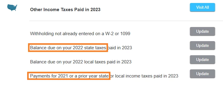 If someone didn't pay 2020 and 2021 federal or state taxes in the years they were due, but did pay them (plus penalties and interest) in 2023, where should they record those payments in TurboTax desktop for 2023? I see a place to enter past-due state taxes paid in 2023 (screenshot below), but I don't see the equivalent for federal. Can anyone help?