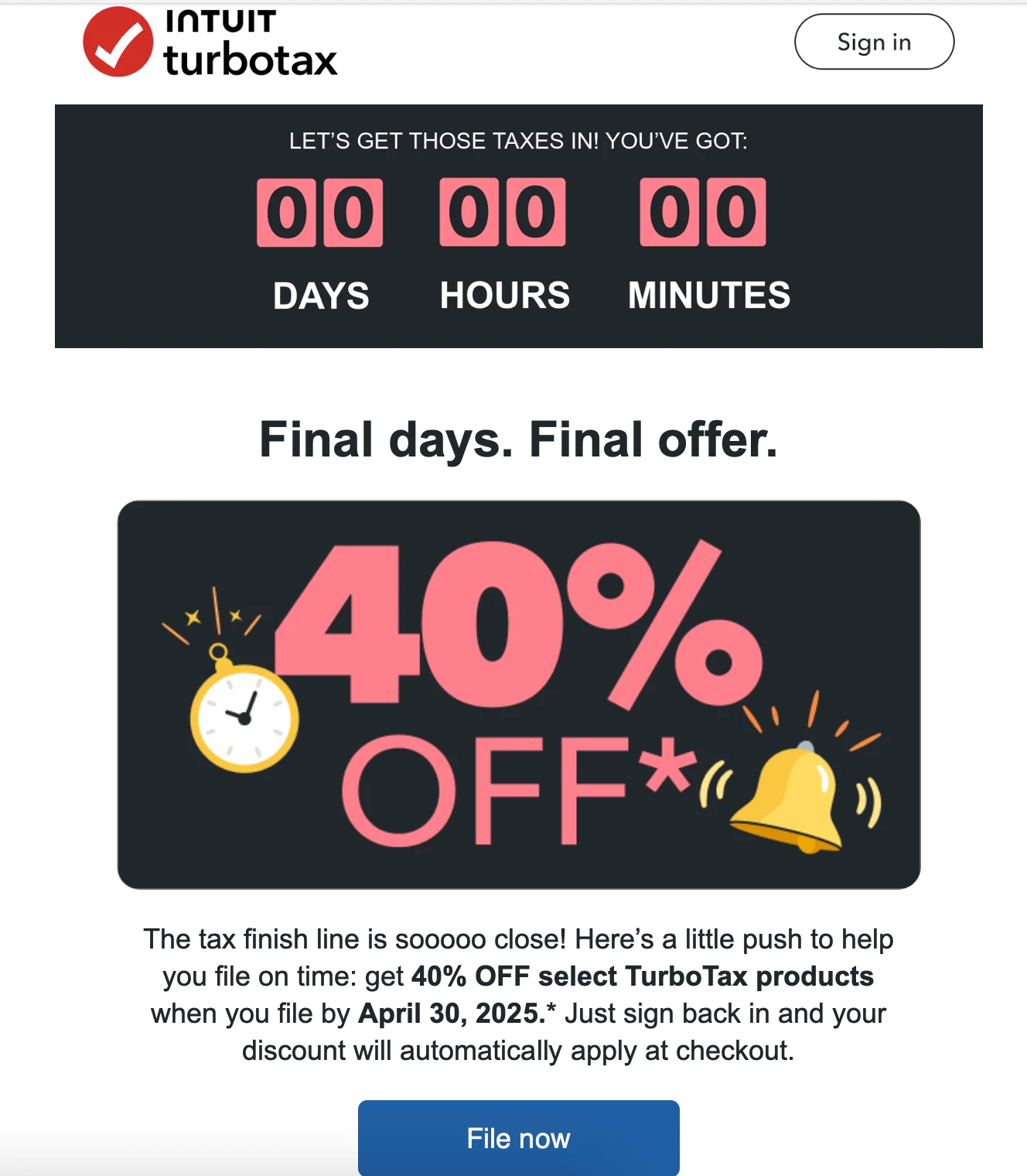 The tax finish line is sooooo close! Here’s a little push to help you file on time: get 40% OFF select TurboTax products when you file by April 30, 2025.* Just sign back in and your discount will automatically apply at checkout. Discount not applied