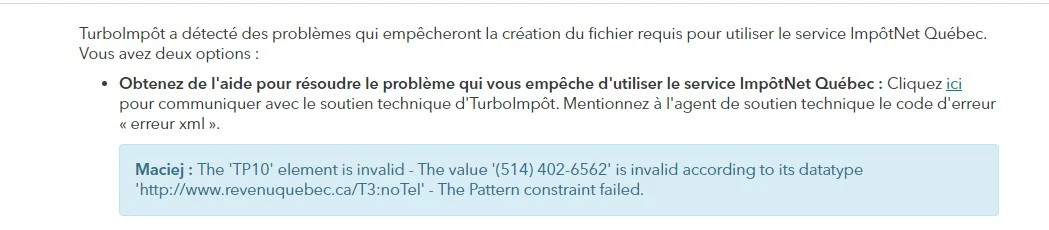 Cette erreur signifie que le format utilisé pour le numéro de téléphone n'est pas accepté par Revenu Québec. Nous vous suggérons d'utiliser plutôt un numéro sans les tirets et les paragraphes.