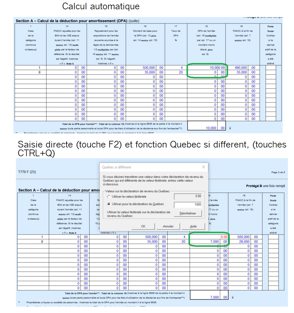 Si vous voulez plutôt choisir que la dépense d'amortissement se fasse entièrement sur les biens de la catégorie 8, vous pouvez tout simplement annuler (ou réclamer un montant moindre) la dépense demandée pour la ligne de l'immeuble à l'aide d'une saisie directe (touche F2).  Vous remarquerez aussi la petite fleur-de-lys (CTRL+Q) qui apparaîtra et vous permettra de réclamer un montant différent dans votre déclaration du Québec.