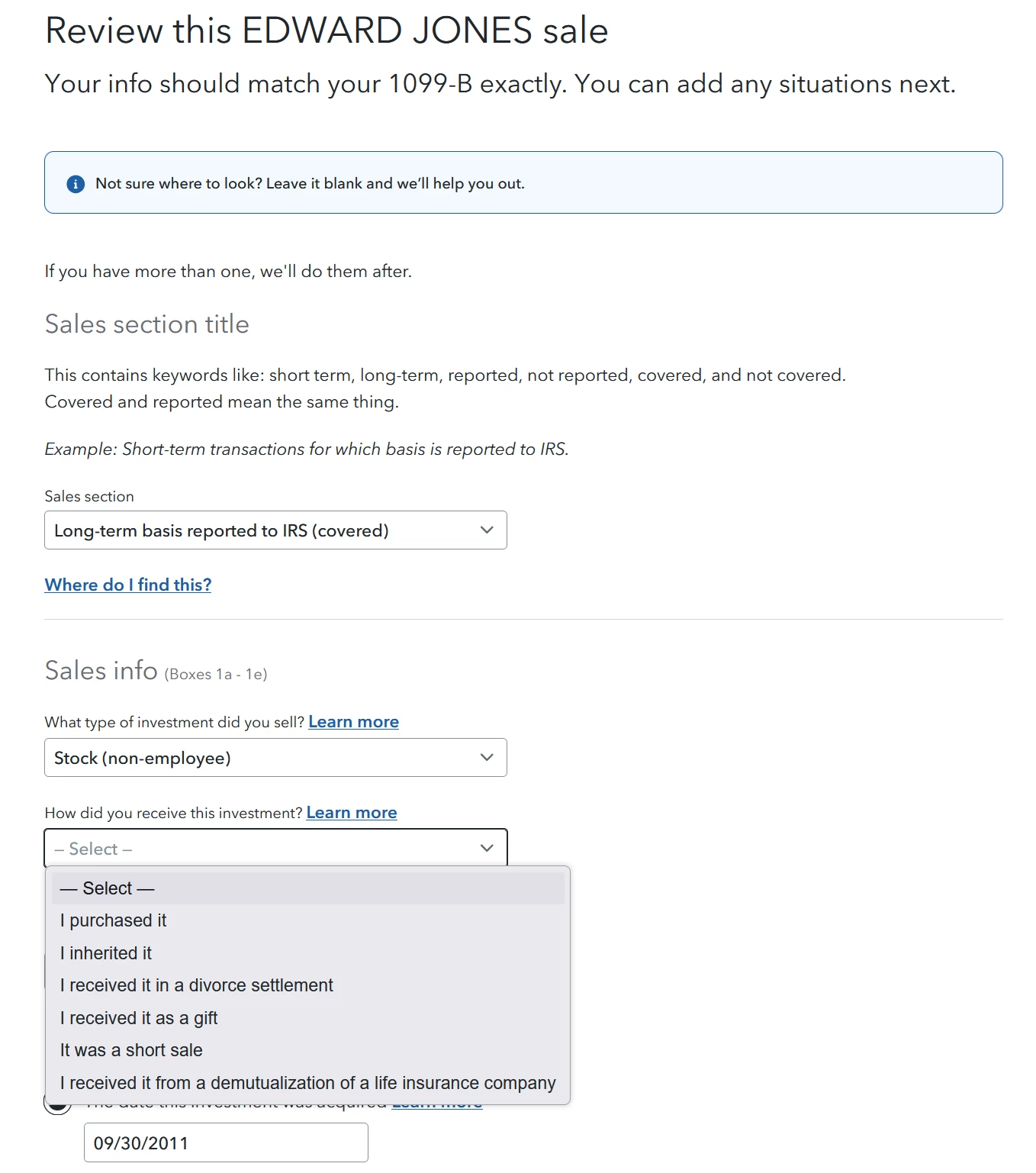 One of the other options under "What type of investment did you sell?" is Options but that just narrows the next choice to 2 (I purchased it or I received it in a divorce settlement).