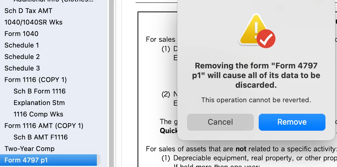I followed the instructions listed here , but it does not allow me to delete the original entry. I can add a new entry and delete before I select done, but there is no way to edit the original entry which is what I need to do. Alternative would be to directly edit form 4797, but that is not editable either.