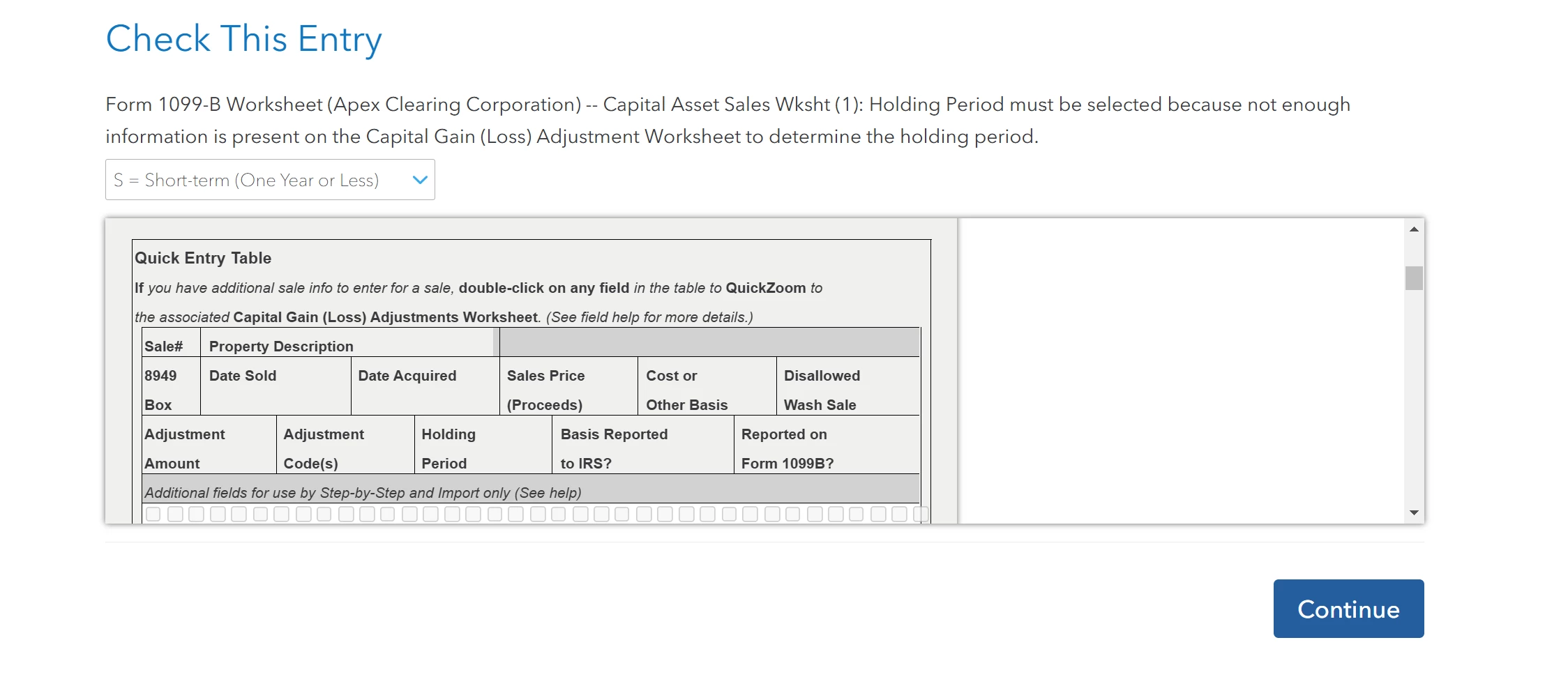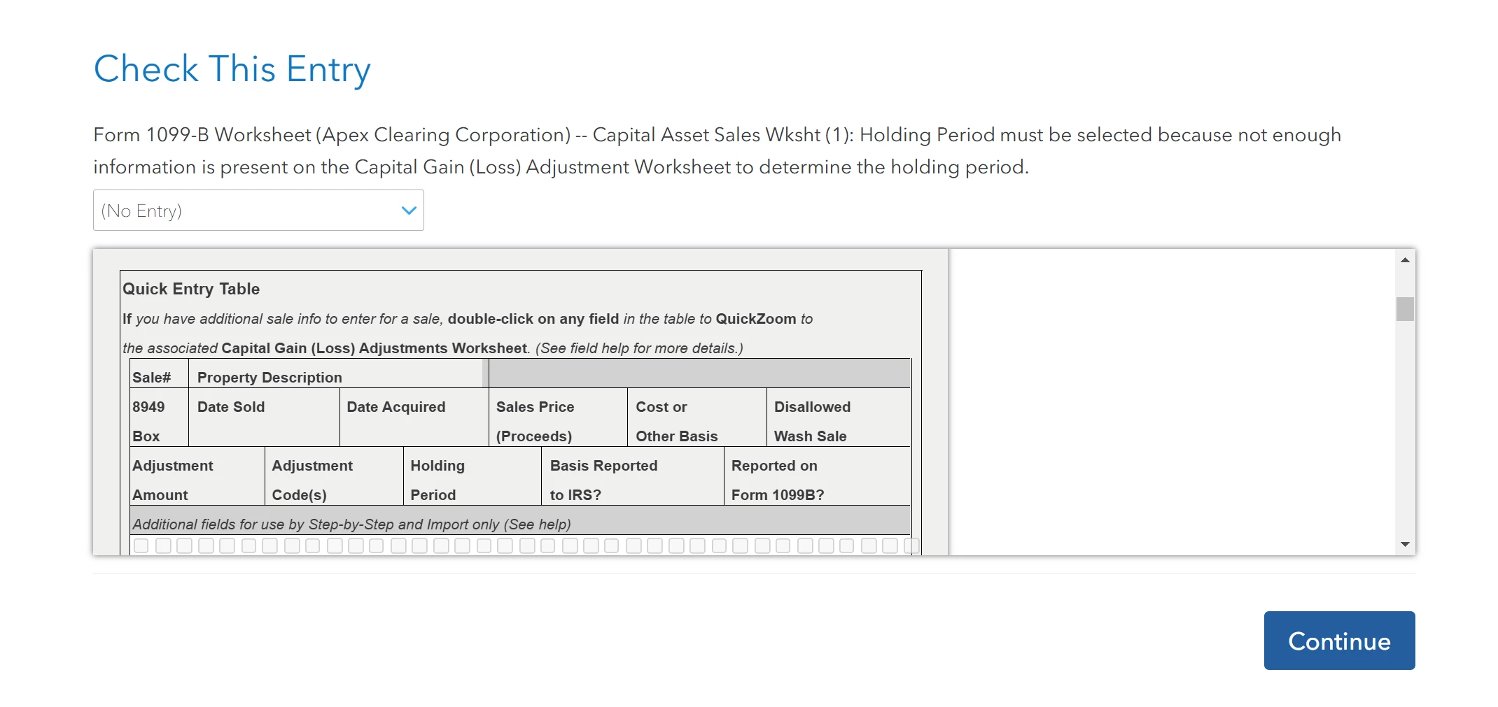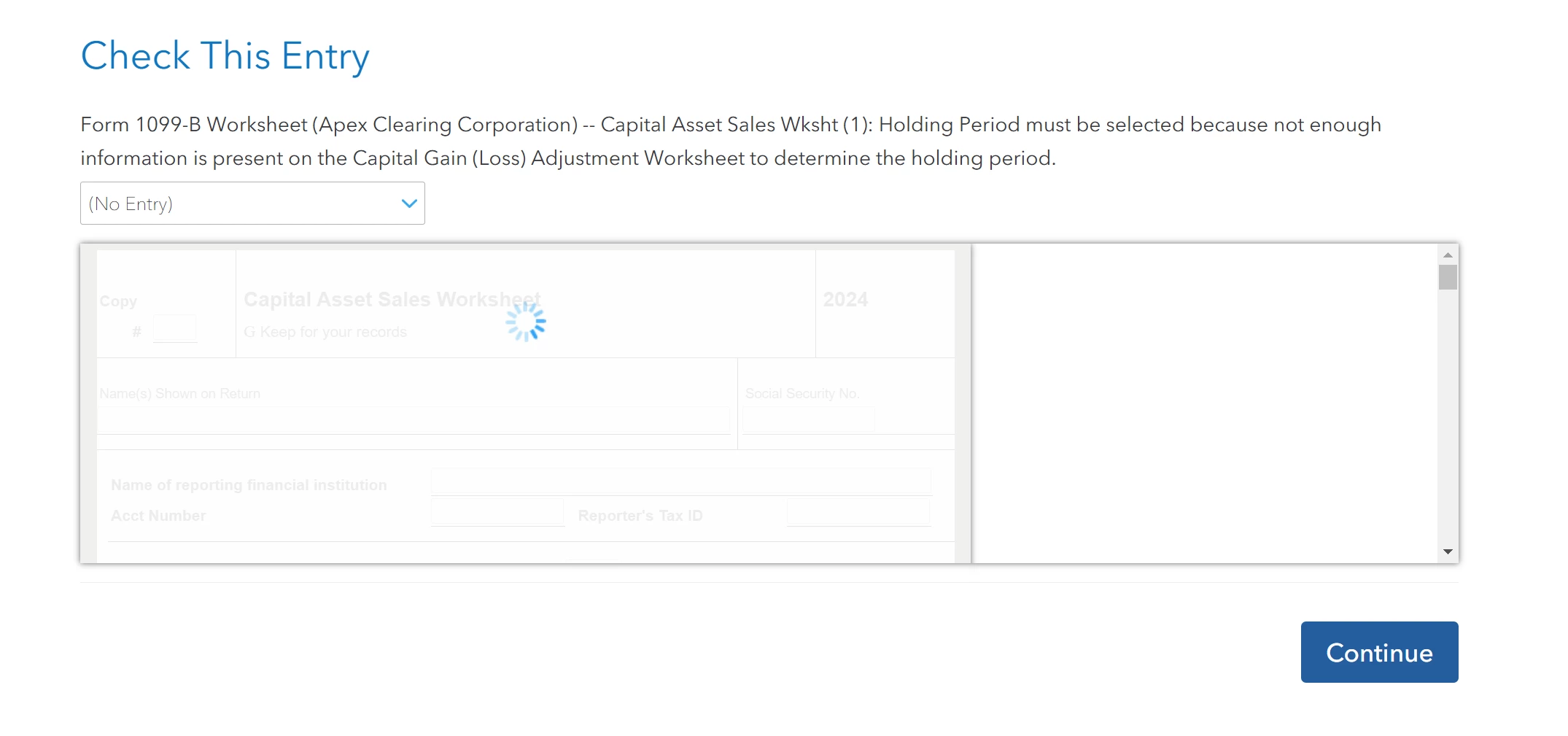 In the review portion it is asking me to "Check this entry" It wants me to enter the "Date Acquired" of an stock market option. When I enter the information, it just refreshes the page and asks for the same information. I am not sure what is happening. I have attached an example below, same document, different field being asked to input something that doesnt save.