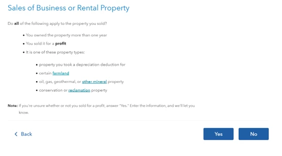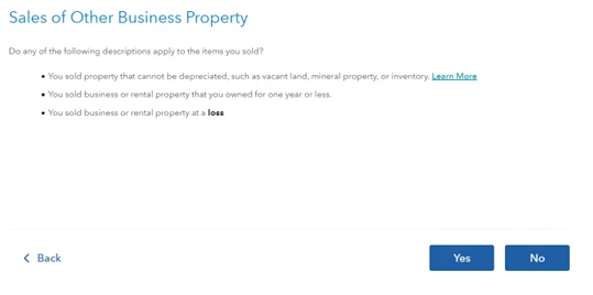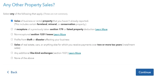I am not sure If I am making the correct selection in Turbo Tax to recapture the depreciation. I followed the guidance as posted in the other questions. Wages & Income >Other Business Situations > Sale of Business Property >Start or Revisit > Enter your sale