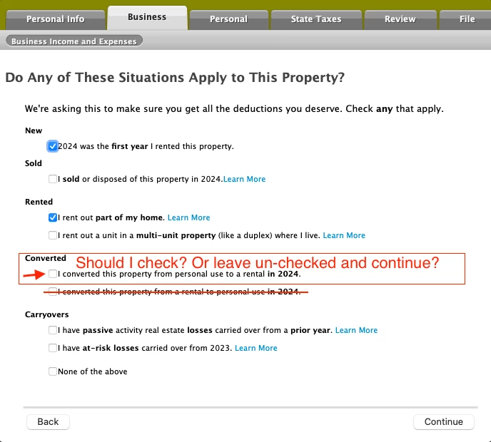 - Checkbox 1: "I converted this property from personal use to a rental in 2024";
