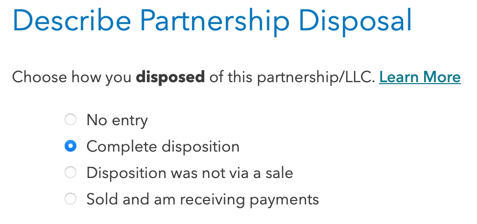 >Complete disposition seemed most applicable here as I did not sell my interest in the partnership, rather the partnership was liquidated. This option, to my understanding, generates a final K1