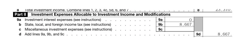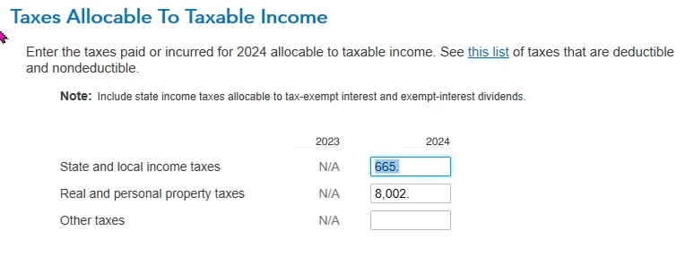 The description on line 9b states "State, local, and foreign income tax" are included on this line. The accountant is interpreting this statement as "State Income Tax, Local Income Tax, and Foreign Income Tax which is ignoring the Local Real Estate taxes paid.