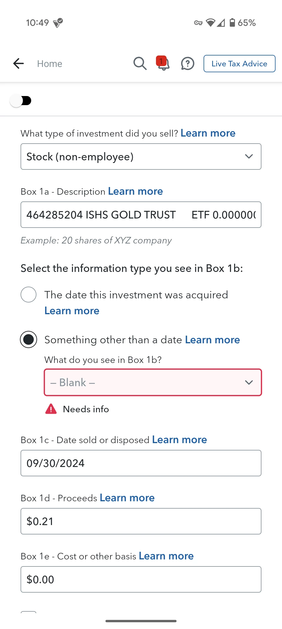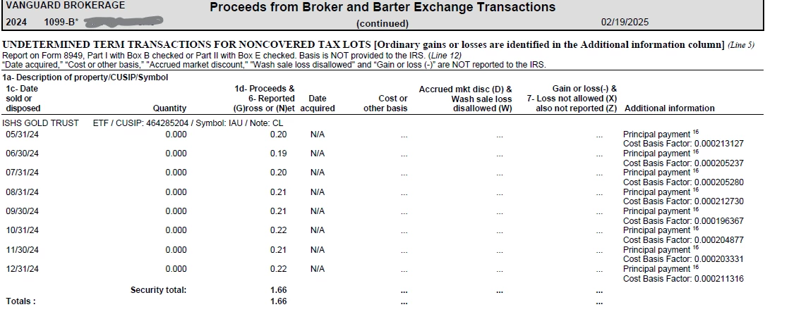 I've included my 1099-b with additional info regarding the gold ETF. I'm getting some sections that are flagged for review in TurboTax. It's asking for a acquired date. The 1099 b lists N/A, me thinking blank is the closest match, I chose this. Now it's wanting a cost basis. I don't know what to put. Ive been seeing this as a issue on here, and I'm a bit overwhelmed with the range of solutions. Happy to answer any questions if it will help with a solution