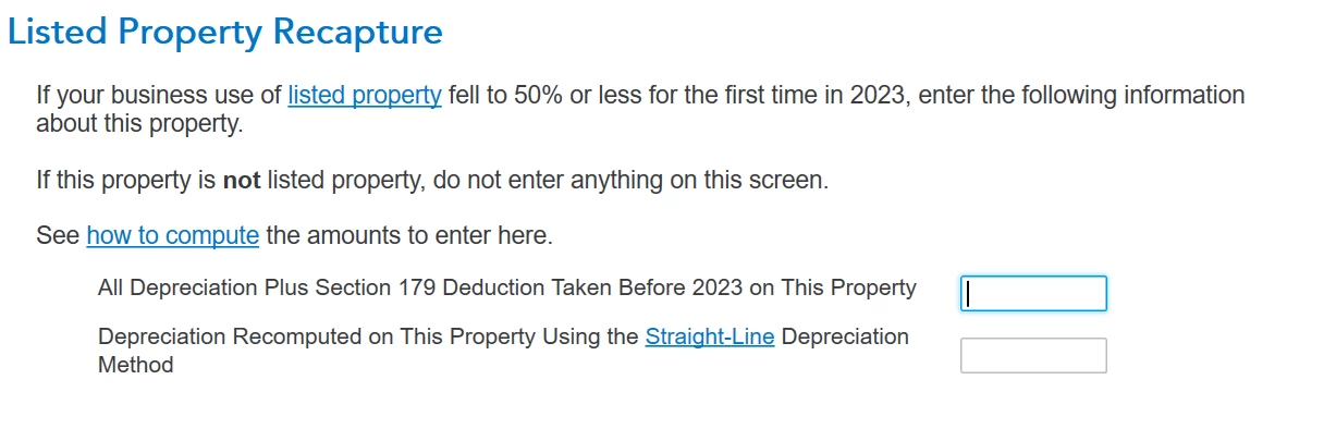 I followed the instruction on TurboTax. Go to the Less Common Business Situations section. Choose Sale of Business Property. On the next screen, Any Other Property Sales?, check the recapture box to enter your recapture information. I had business miliage and personal miliage for each year from 2012~2022.